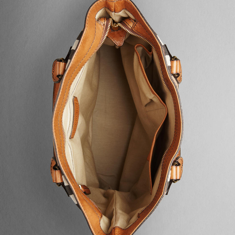 - Top zip closure, two rolled leather handles, detachable leather shoulder strap
