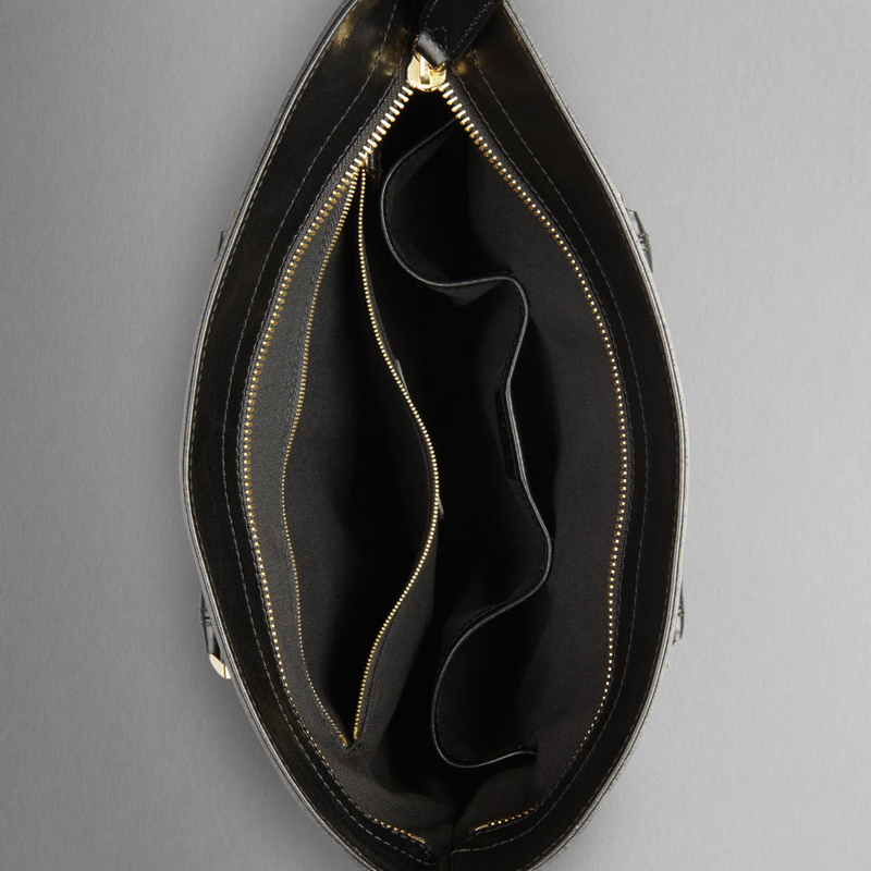 - Top zip closure, two rolled leather handles, detachable leather shoulder strap with polished metal attachments