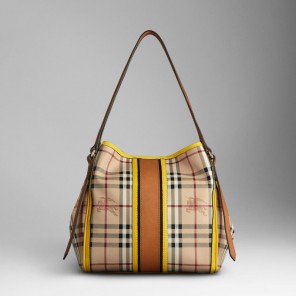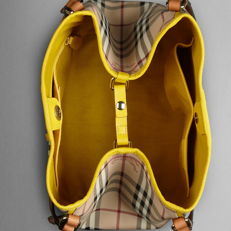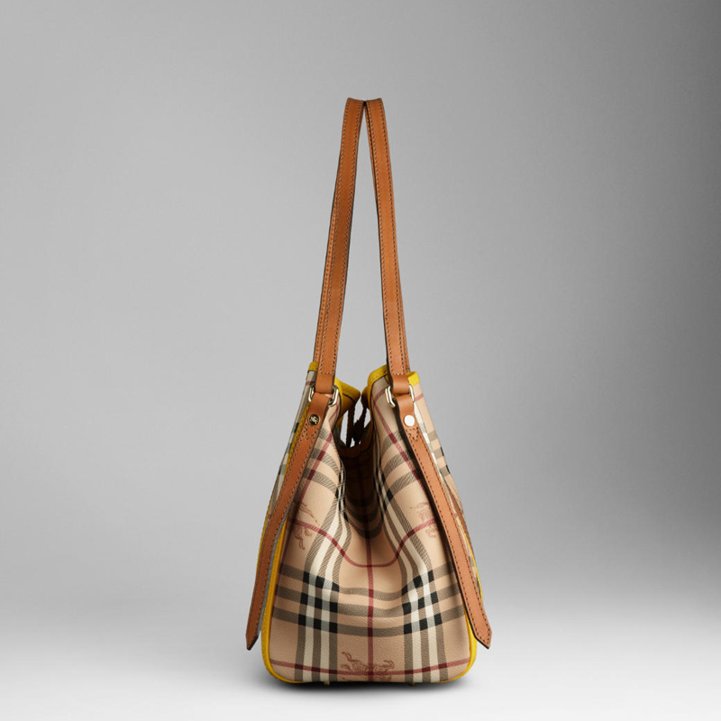 Haymarket check coated canvas tote bag with coloured leather centre panel