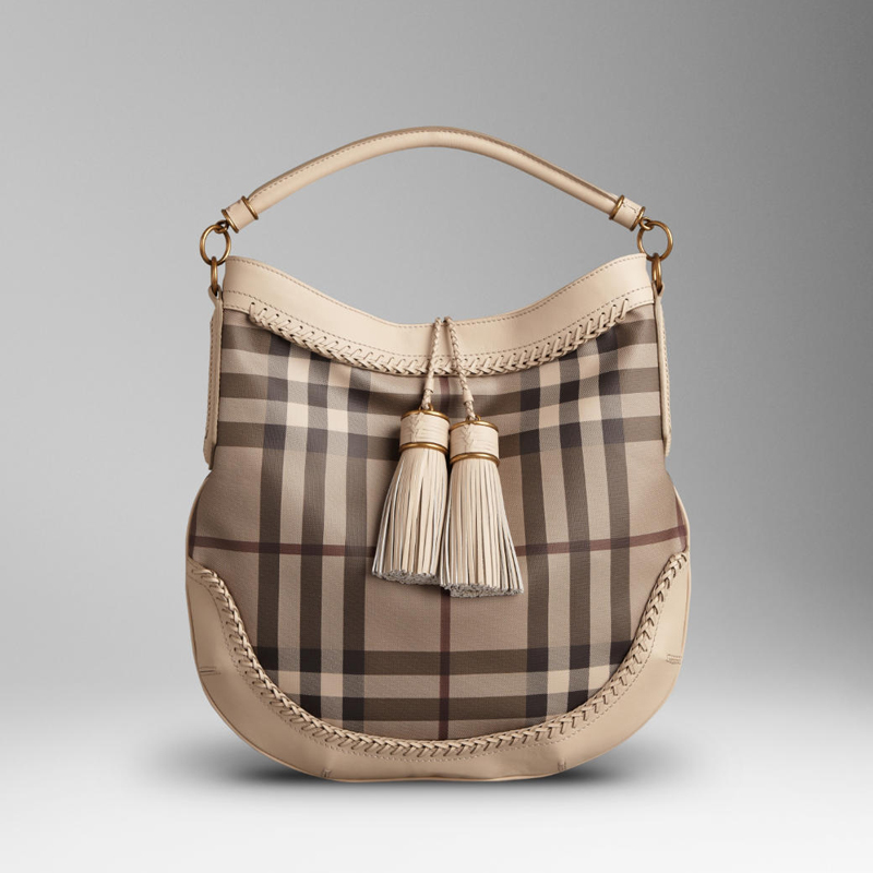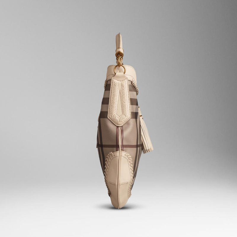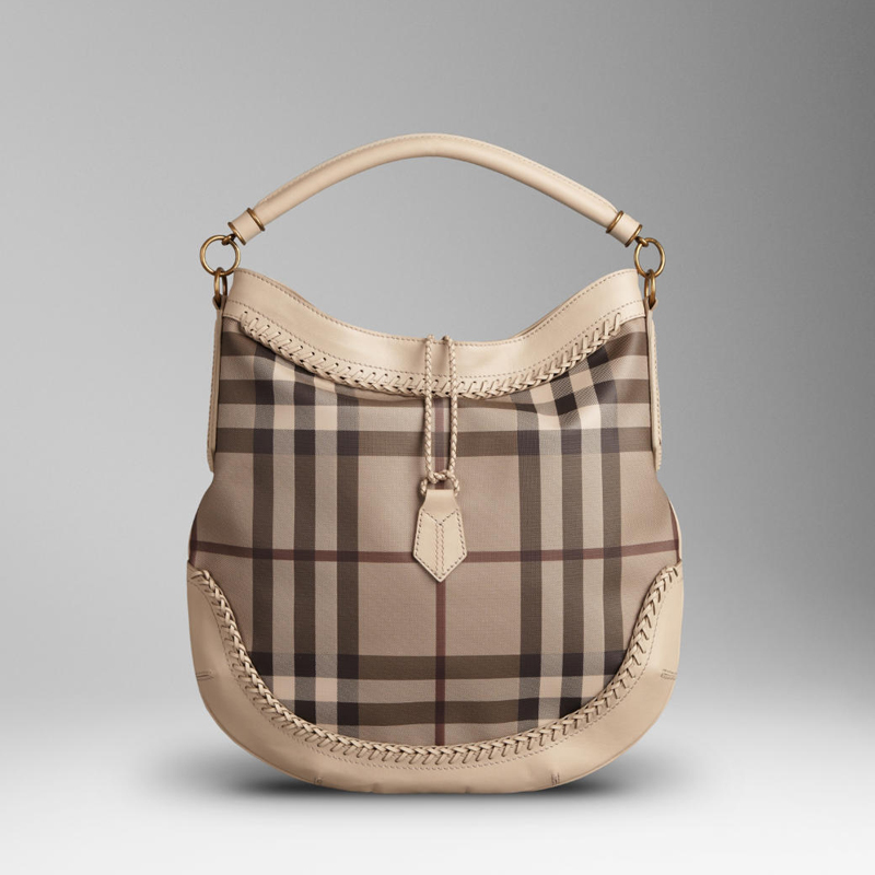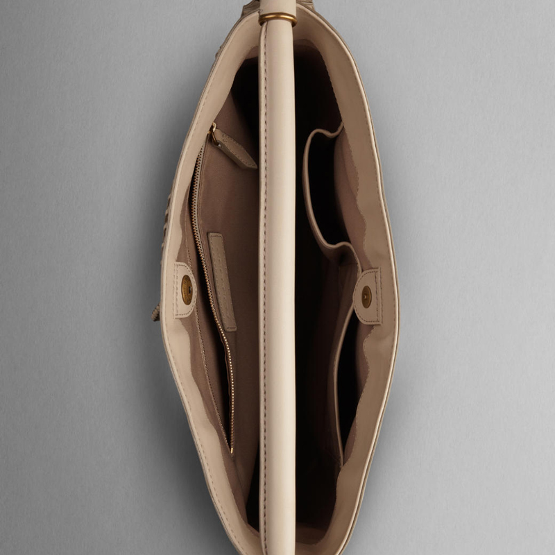 - Rolled leather handle with polished metal attachments and woven leather trim, snap-button closure