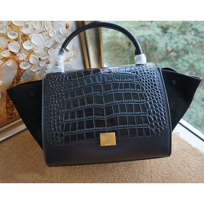 Celine Trapeze Bag Croco Ferrari Suede Leather C6608 Black