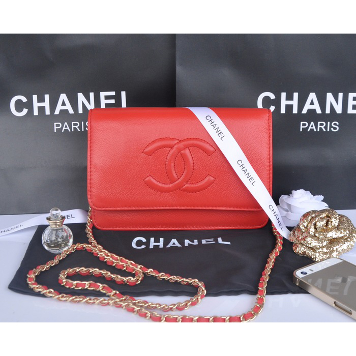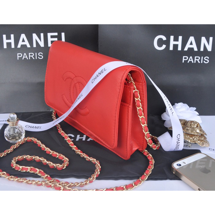 2014 Chanel Flap Shoulder Bag Red Calfskin Leather A33817 Gold