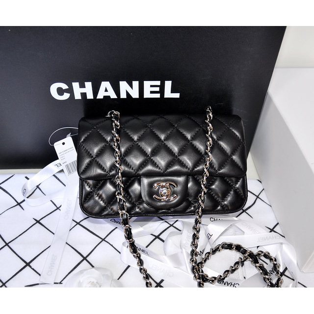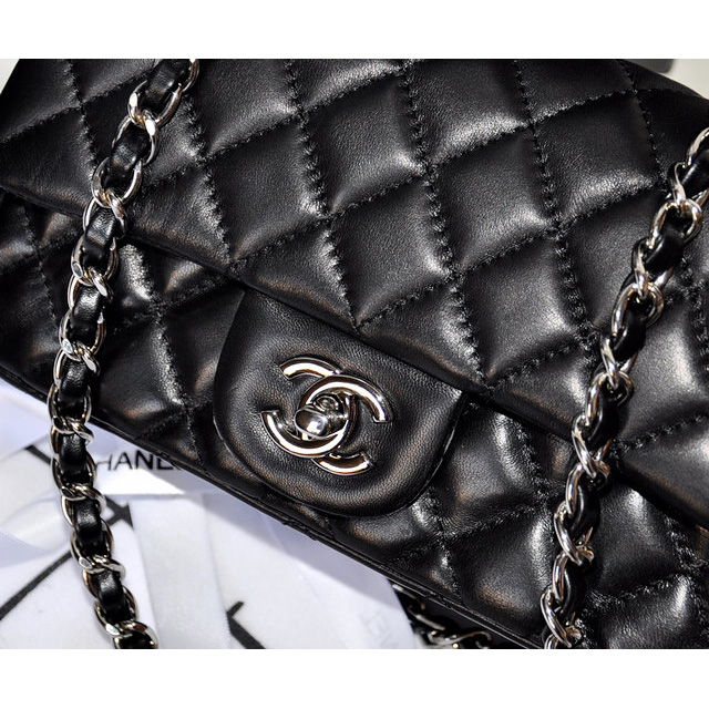 2014 Chanel mini Classic Flap Bag Original Black Sheekskin leather 1117 Silver