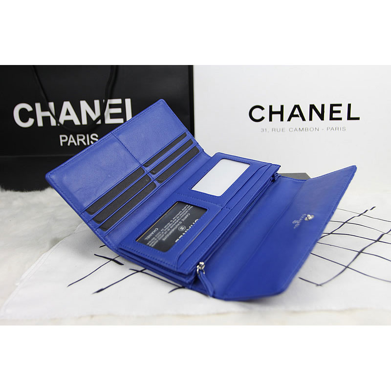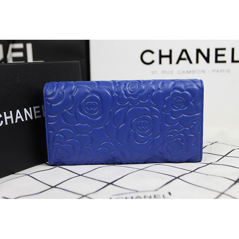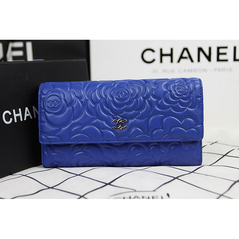 2015 Chanel Camellia Tri-Fold Wallet Original Leater A50084 Blue