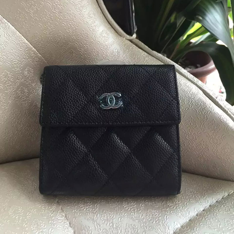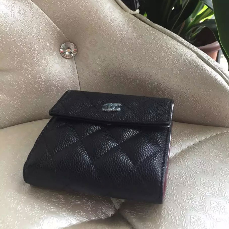 2015 Chanel Matelasse Tri-Fold Wallet Original Caviar Leather A48980 Black with Silver