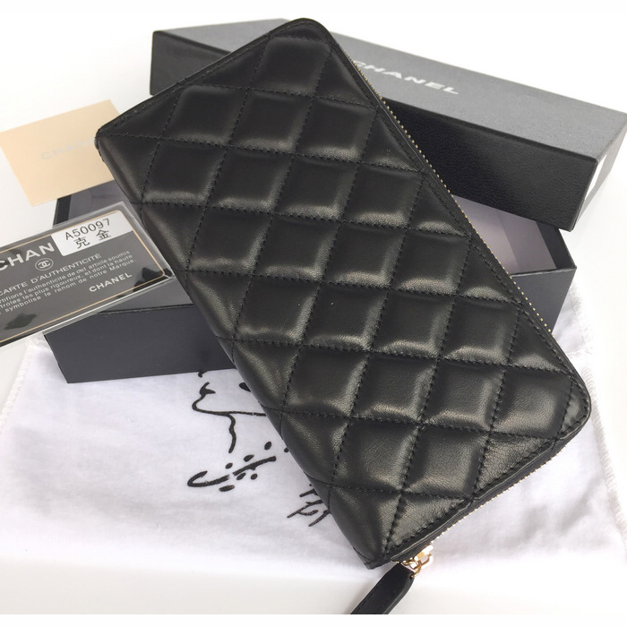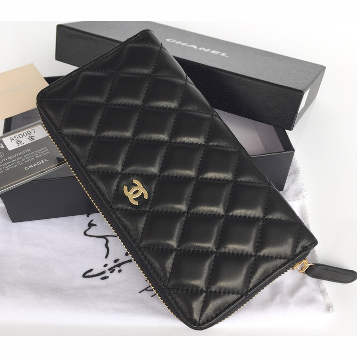 2015 Chanel Matelasse Zip Around Wallet Black Original Sheepskin A50097 Gold