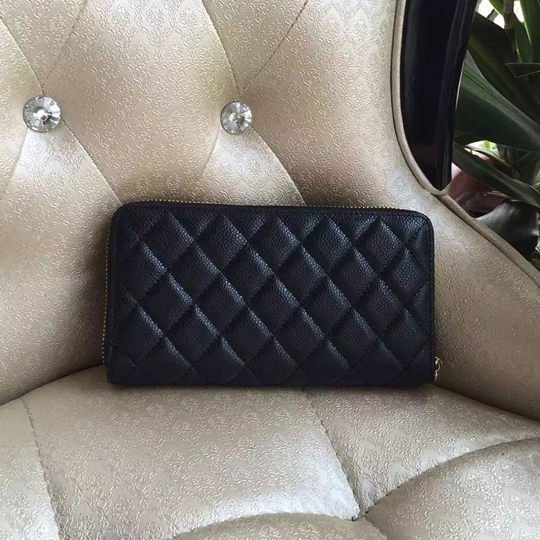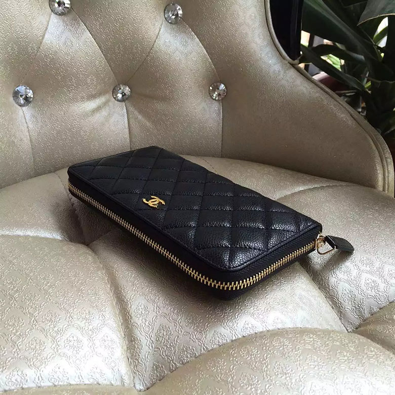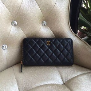 2016 Chanel Matelasse Zip Around Wallet Black Original Caviar leather A50097 Gold