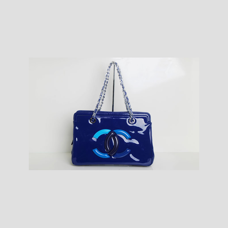 - Small lipstick patent calfskin shopper with a large CHANEL embedded signature and leather-interlaced chain.