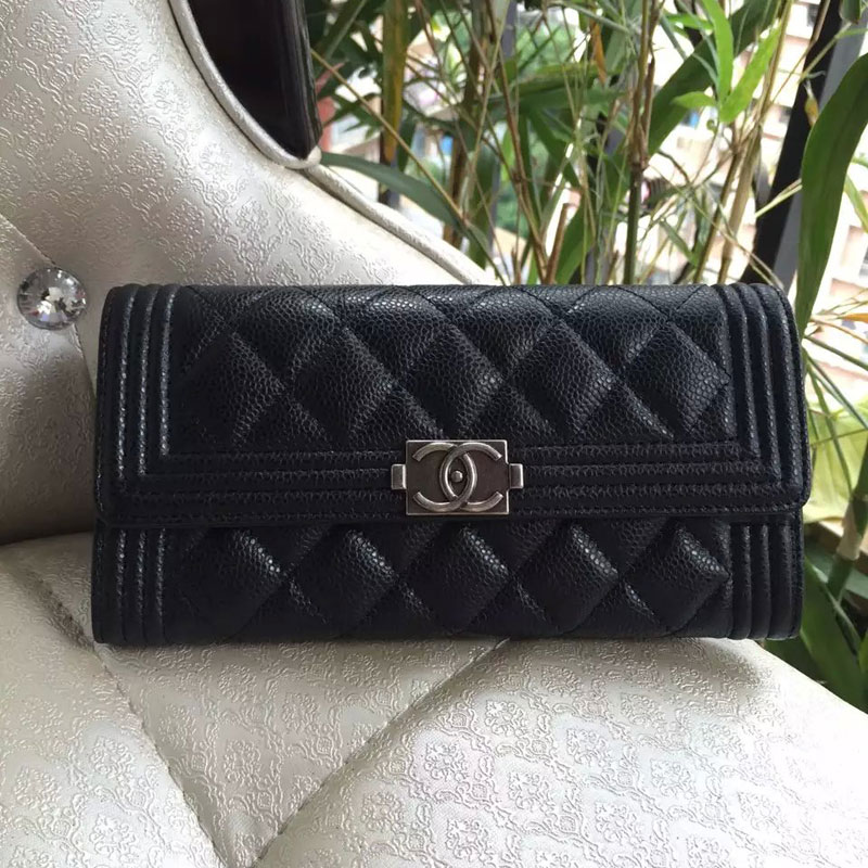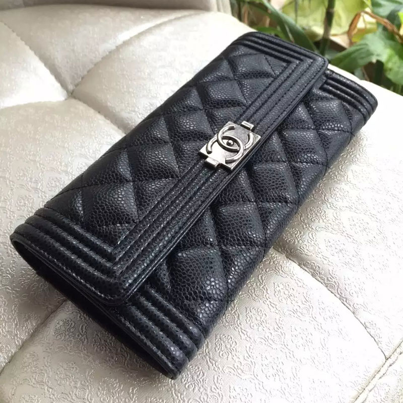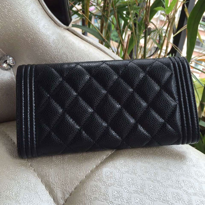 Boy Chanel Embroidery Bi-Fold Wallet Original Caviar Leather A80286 Black