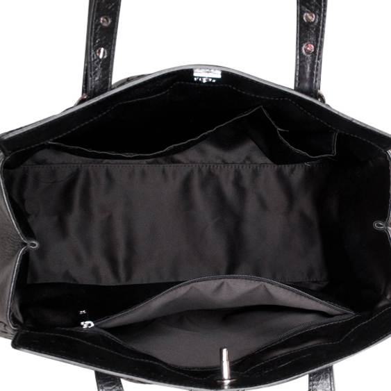 - Squeeze-to-open clasp closure and canvas lining