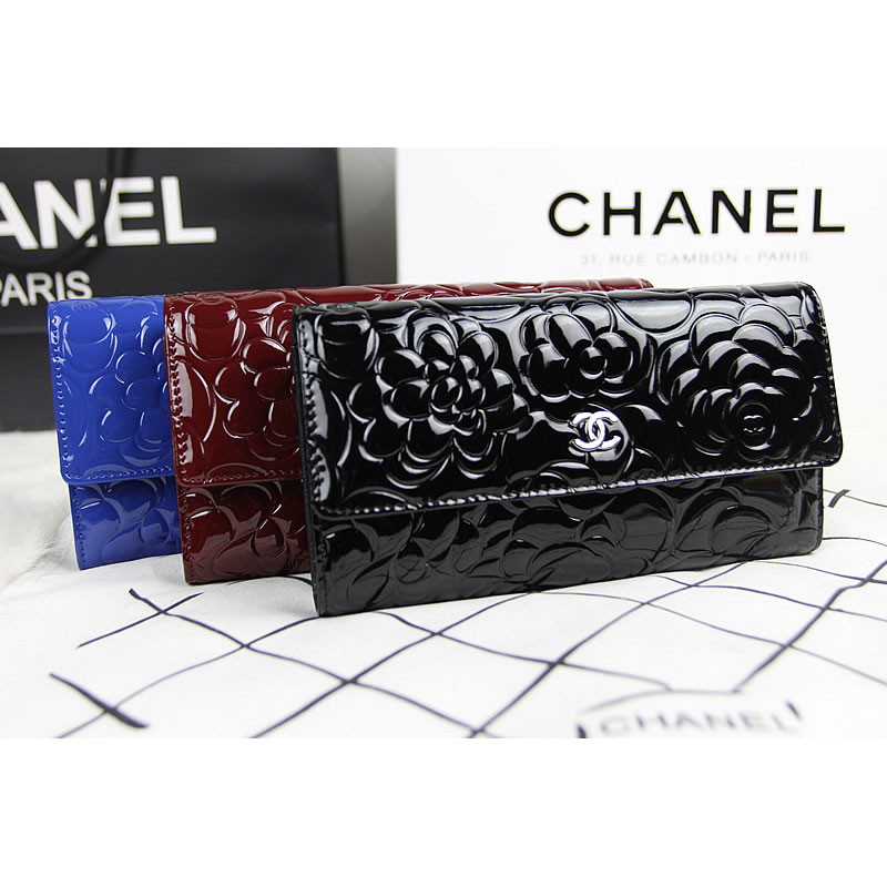 Chanel Camellia Tri-Fold Wallet Original Patent Leater A50084 Black