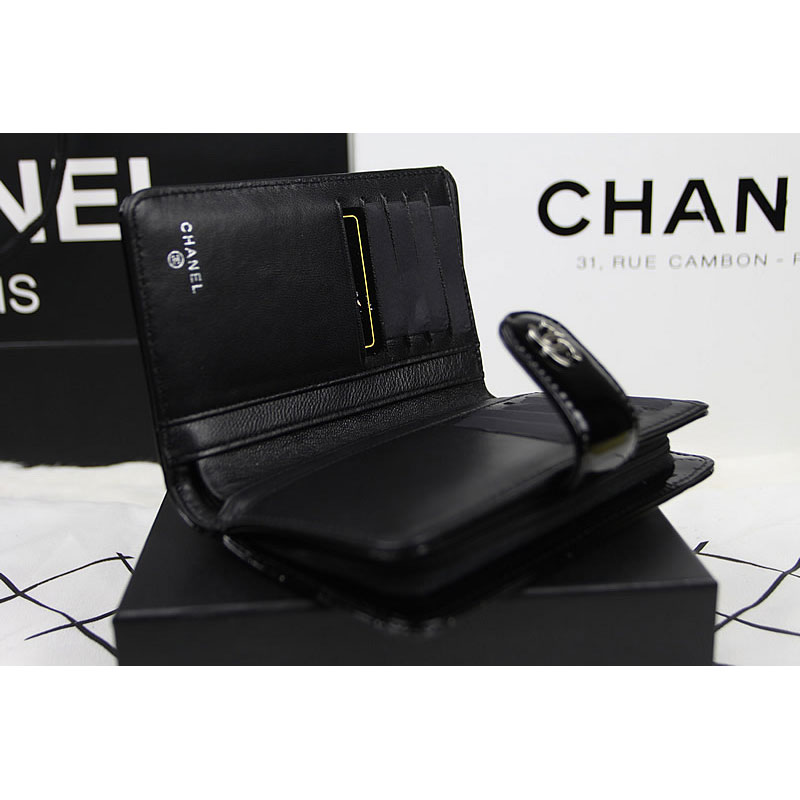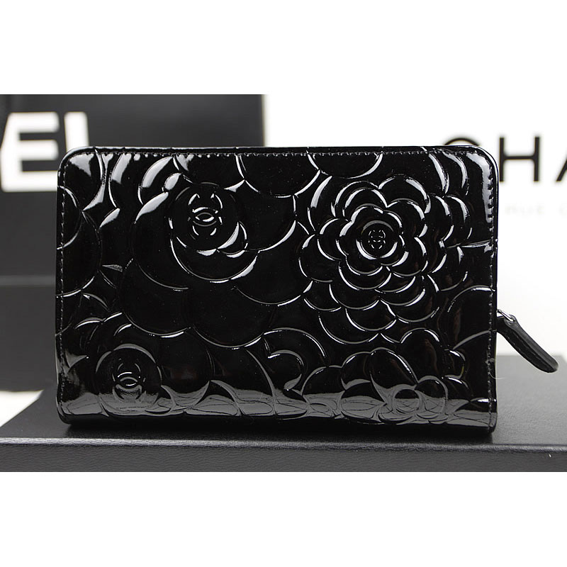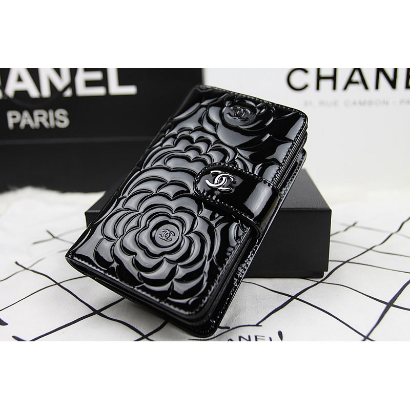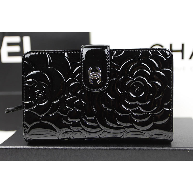 Chanel Camellias Bi-Fold Wallet Original patent Leather A50087 Black