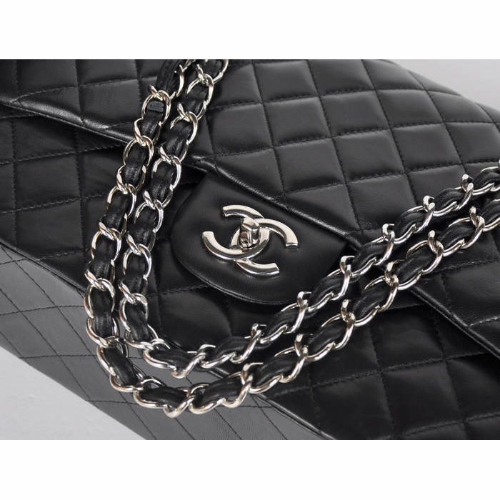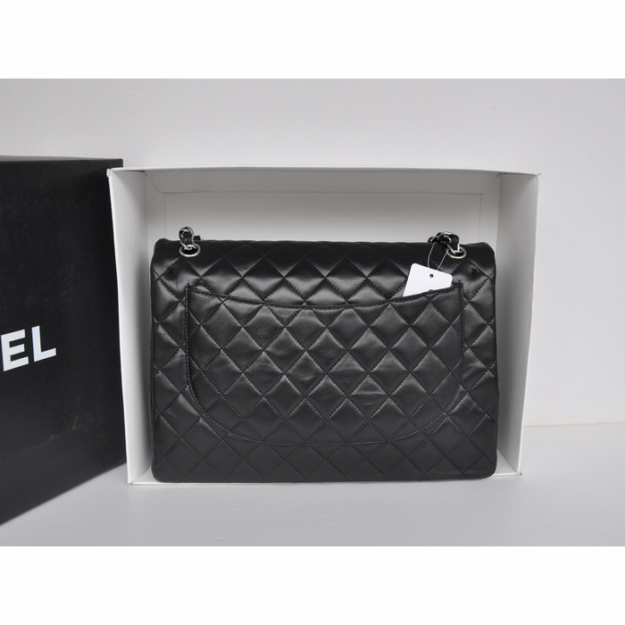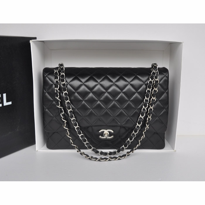 Classic Chanel Maxi Double Flaps Bag A36098 Black Original Lambskin Leather Silver