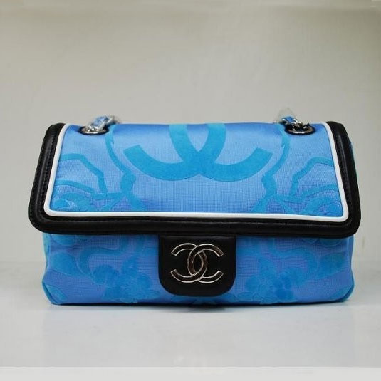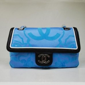 - A bag of art and blue embroidery, black piping, classic style with a flap