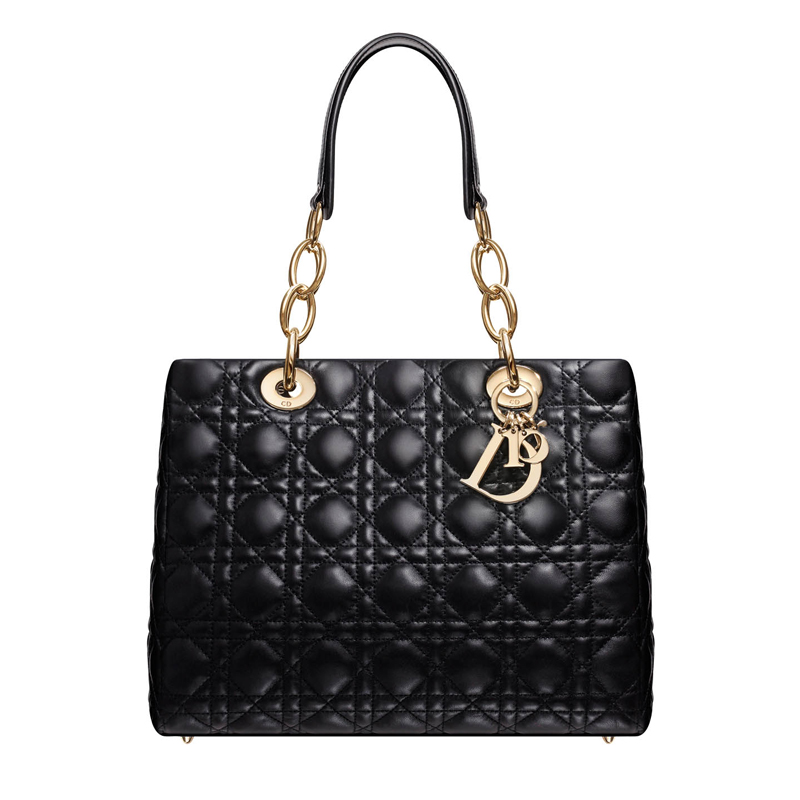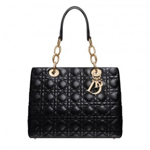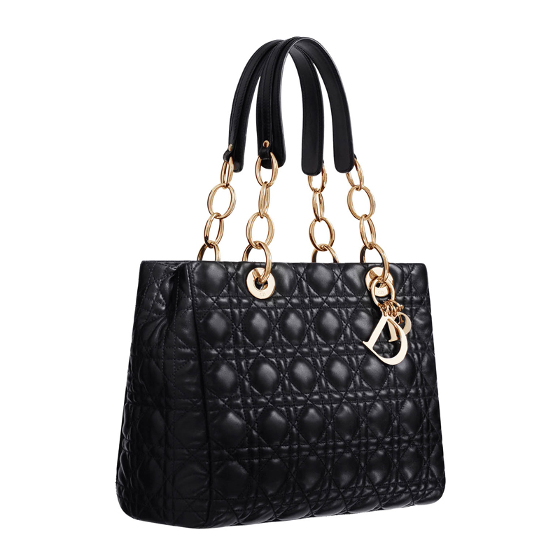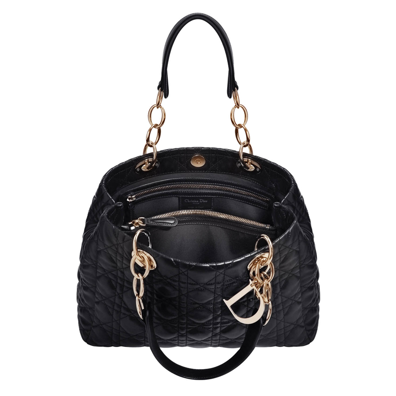 - This black lambskin bag is adorned with 'Cannage' stitching that lends suppleness to the leather. Its handles that intertwine leather and pale gold-tone metal chains allow it to be worn on the shoulder.