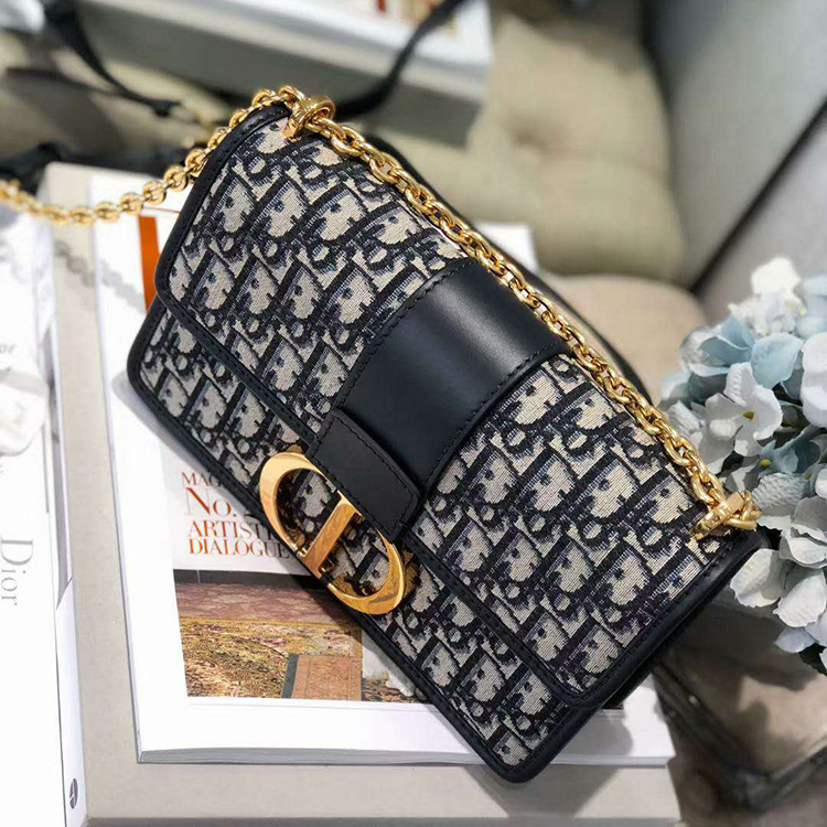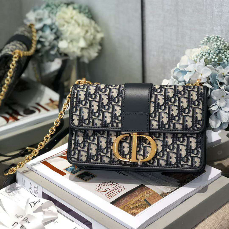 The 30 Montaigne line is inspired by the emblematic address and offers essential pieces that embody the House's iconic codes. This handbag is crafted in blue Dior Oblique jacquard for an elegant and timeless look. The flap is embellished with an antique gold-finish metal 'CD' clasp, inspired by the seal of a Christian Dior perfume bottle. Refined details such as an embossed '30 Montaigne' signature on the back highlight the sleek design.