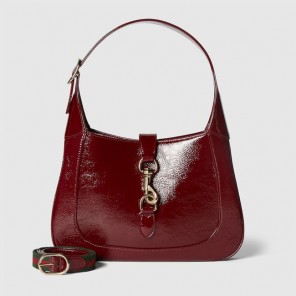 The new Gucci Jackie is crafted from fine leather which highlights the craftsmanship, crescent shape, and sleek silhouette of the House's iconic shoulder bag. Light gold-toned hook closure, leather trim, and an additional strap featuring the green and red Web gives this Gucci Jackie small shoulder bag in Gucci Rosso Ancora leather, the signature red hue of the House, further styling options.