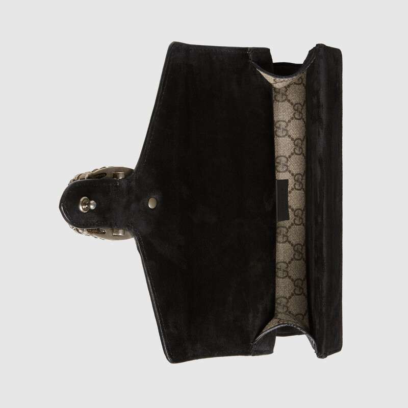 The small Dionysus shoulder bag is presented in the signature GG pattern, trimmed with red suede details. The shape is defined by the defining tiger head closure鈥攁 unique detail referencing the Greek god Dionysus, who in myth is said to have crossed the river Tigris on a tiger sent to him by Zeus鈥攆urther enhanced with sparkling crystals. The sliding chain strap can be worn multiple ways, changing between a shoulder and a top handle bag.