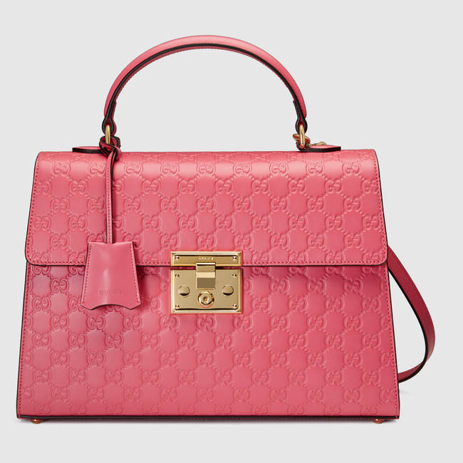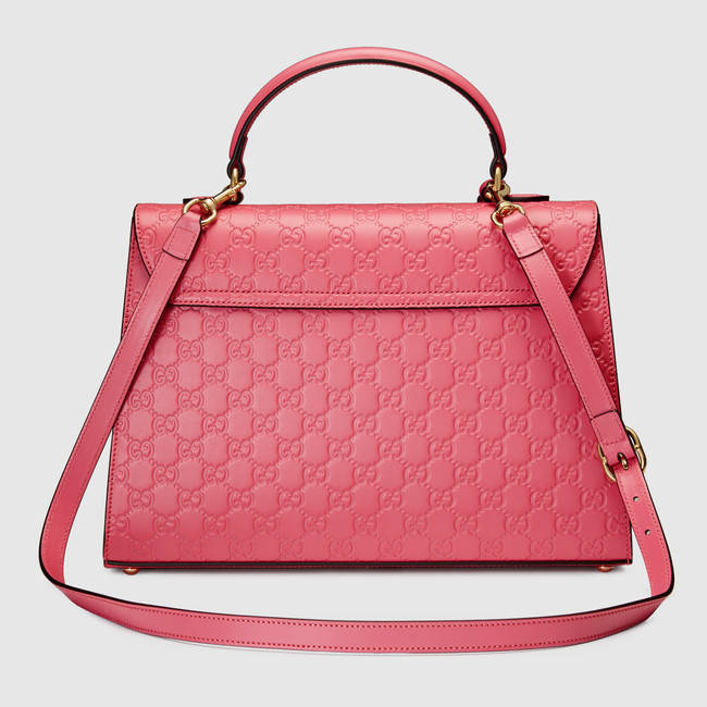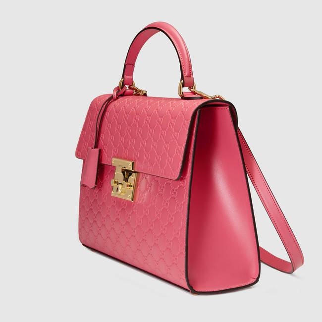A new shape from the Padlock collection, this medium size top handle bag has our key lock closure pulled straight from the archives, the key is placed in a leather key case that loops around handle. Made in our heat embossed Gucci Signature leather resulting in a defined print with a firm texture.
