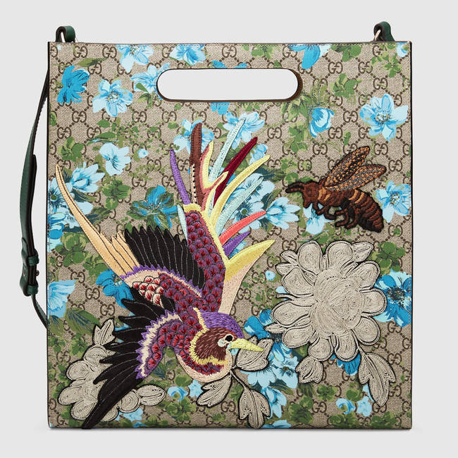 Medium-size Gucci XL tote in GG Supreme canvas printed with a floral motif and embroidered with intricate bird, bee and cloud appliques. Finished with an adjustable shoulder strap.