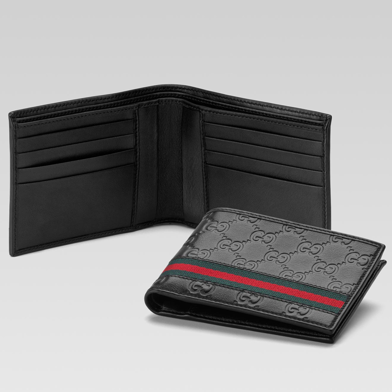 - black guccissima leather with green/red/green signature web and black leather trim - eight card slots and two bill compartments - closed: 13 x 9.5 x 2 cm - open: 26 x 9.5 x 2 cm