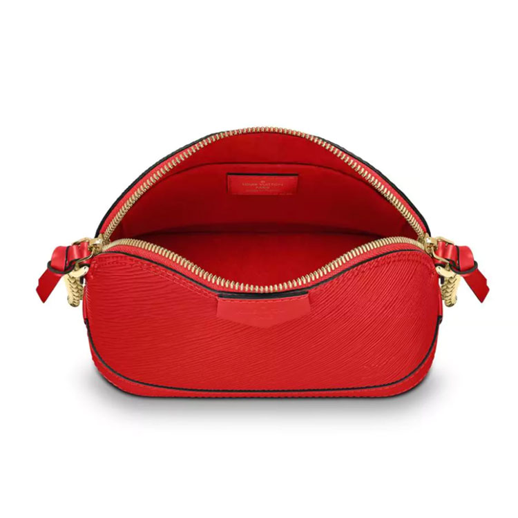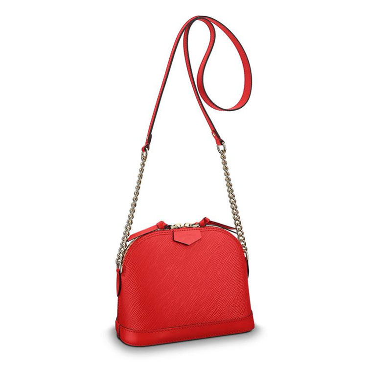 This adorable version of the ladylike Alma in grained Epi leather is a versatile day-to-evening piece. Trendy yet timeless, it features a long strap – perfect for cross-body wear – adorned with a golden-chain detail. Signatures include an embossed LV logo and a “Louis Vuitton Paris” patch.
