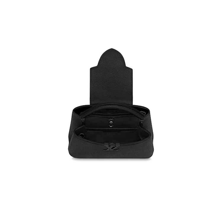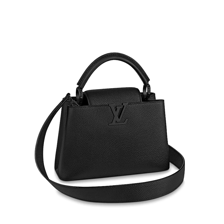 The Capucines Monochrome BB handbag makes an edgy statement. Fashioned from Taurillon leather, it is lined with glossy calf, a feature echoed by the shiny detailing on the wide, removable strap. Tone-on-tone matte hardware underscores the bag鈥檚 cool, minimalist vibe. It can be carried by the top handle, slung over the shoulder or worn cross-body.
