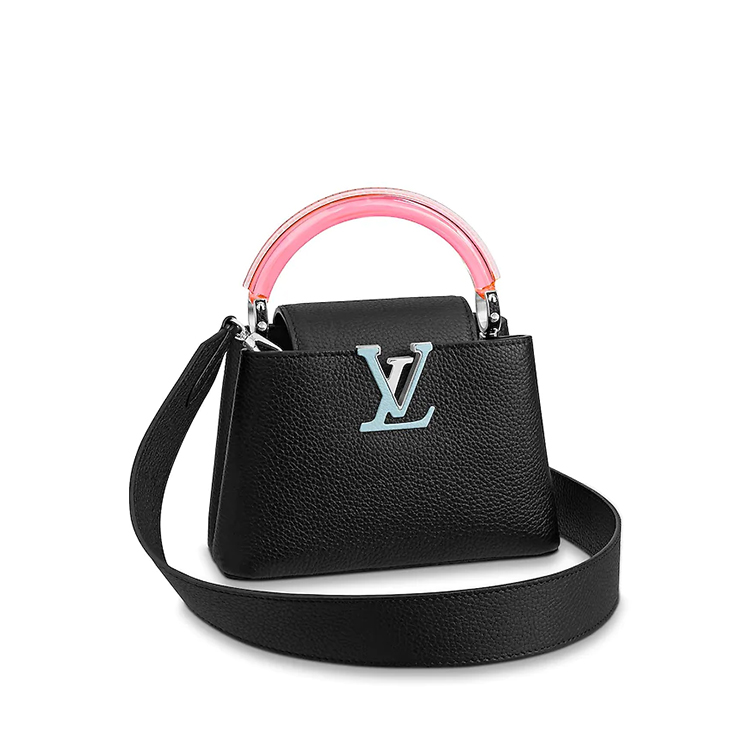 The Capucines Mini bag is made from Taurillon leather and topped with an eye-catching handle in translucent pink plexiglass for a up-to-the-minute feel. The plexiglass top handle brings a summery attitude to this classic handbag. Versatile, it has a detachable strap for shoulder or cross-body carry.