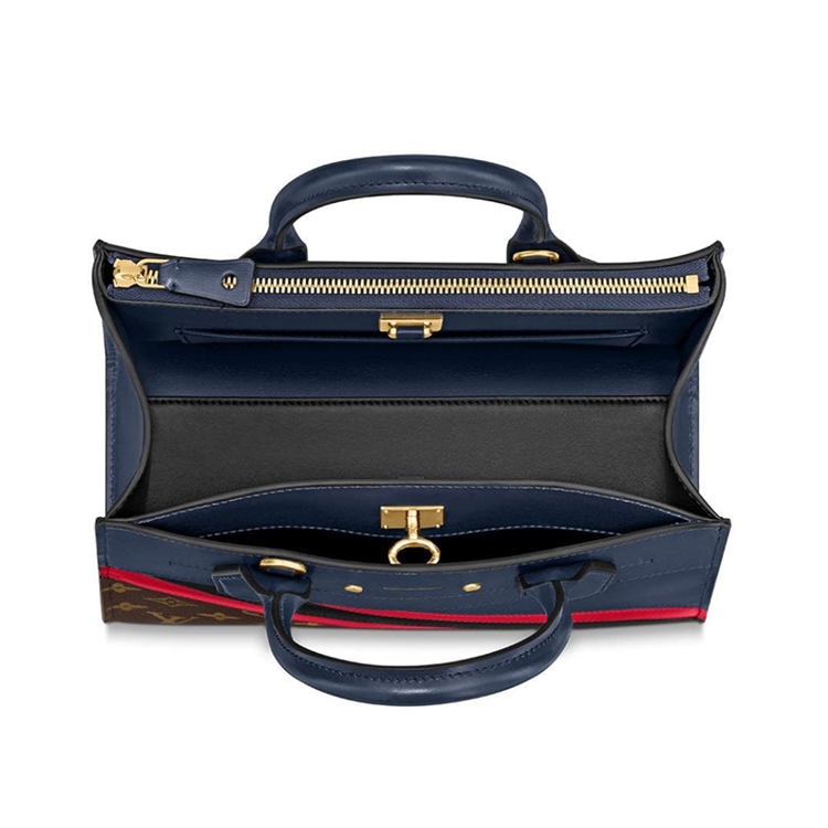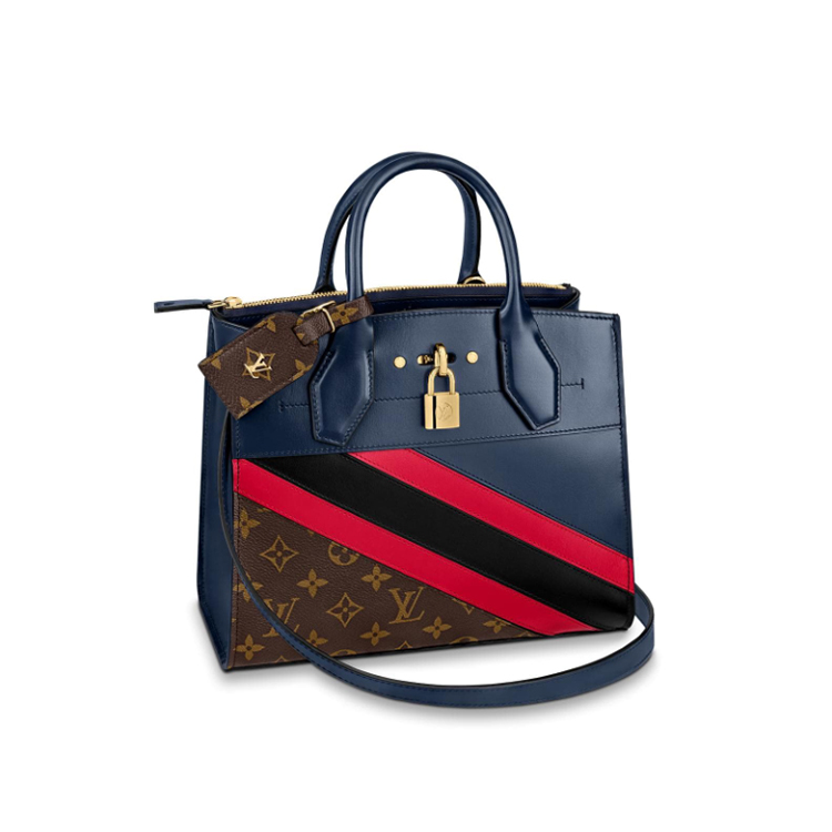 Inspired by Louis Vuitton's heritage of personalizing its trunks and bags, the City Steamer PM handbag in navy-blue calf leather and Monogram canvas is revisited with diagonal red and black stripes. One of the House's most emblematic designs, this bag is acardessorized with an LV-engraved padlock and a luggage tag in Monogram canvas.