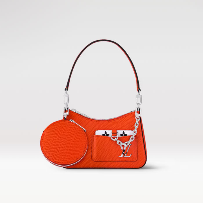 The playful Marellini handbag looks fresh this season in an array of eye-catching colors. Crafted from the Maison’s classic grained Epi leather, this adorably compact model is designed for hand, elbow or shoulder carry. It features a removable round coin purse and – another feminine touch – a Monogram mirror slipped into the front pocket, attached by a silvery chain.