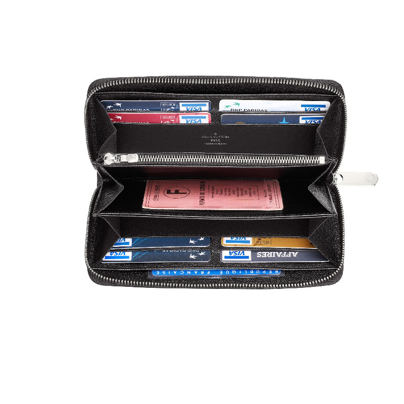 This practical wallet holds bills, credit cards, small change as well as identity papers. It comes in Epi leather and features a zipper closure.