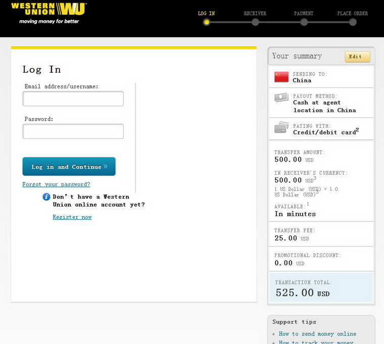 Step 4: 3.if you first time use the Western Union,please click Register now to get a account.