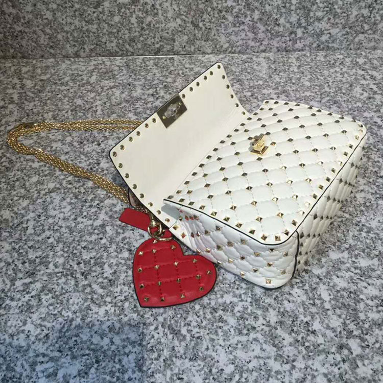 Valentino Garavani Rockstud Spike medium chain bag in Lambskin. Quilted bag with micro stud detailing. The detachable top handle and the adjustable, detachable chain strap mean the bag can be worn as a shoulder bag, a cross body bag, or carried by hand.