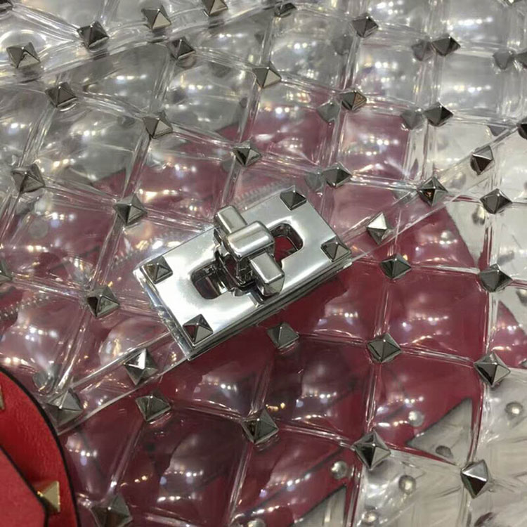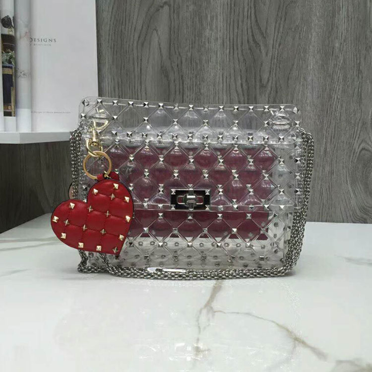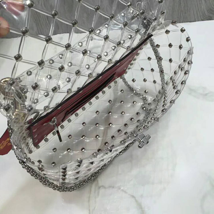 Valentino Garavani Rockstud Spike transparent PVC medium chain bag. Quilted item with micro stud detailing. Thanks to its detachable top handle and sliding, detachable chain strap, this bag can either be worn as a shoulder/cross body bag or carried in the hand.