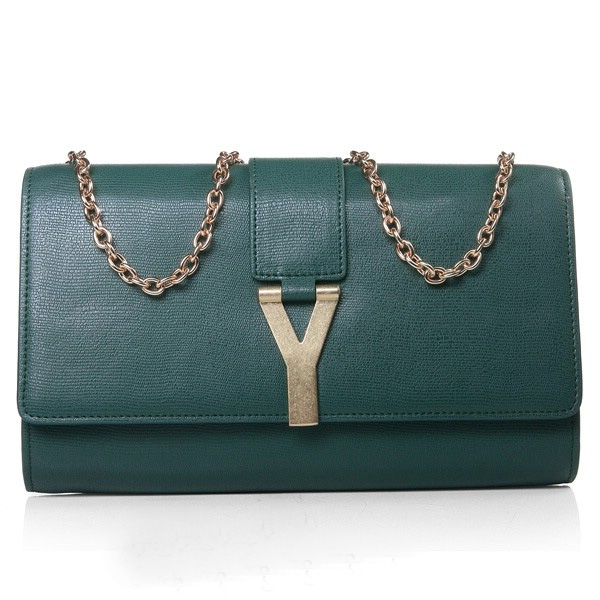 - A signature "Y" in gold-toned hardware is placed above the snap closure