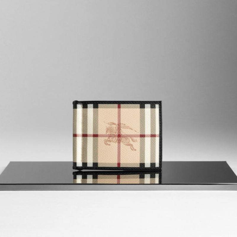 - Haymarket check coated canvas folding card case- Smooth leather trim- Card slots, money clip- 100% PVC with leather trim