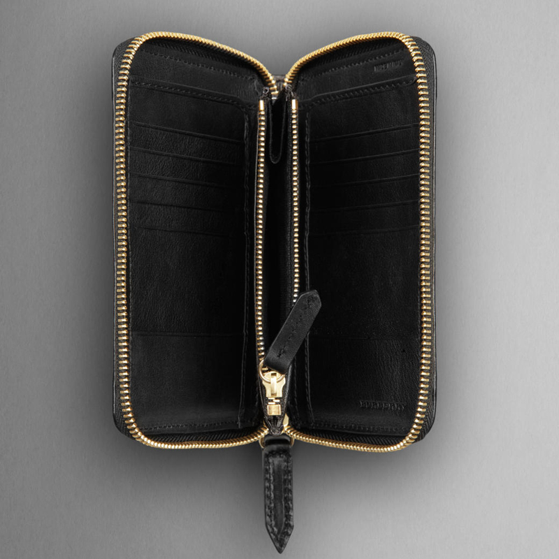 - Bridle leather trim, ziparound closure