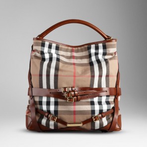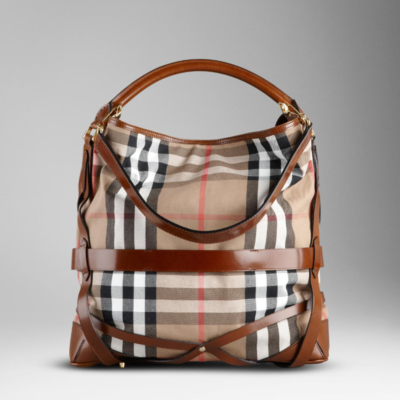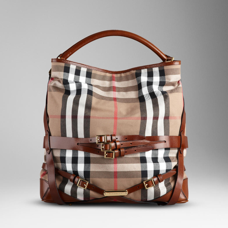 House check coated canvas hobo bag with multiple crossover leather buckle straps