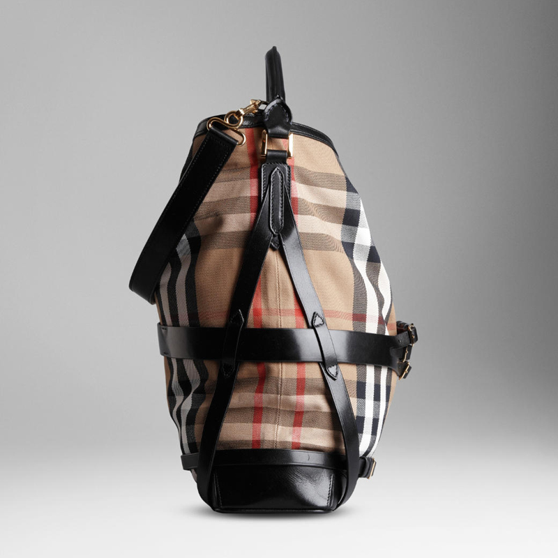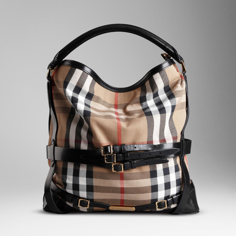 House check coated canvas hobo bag with multiple crossover leather buckle straps