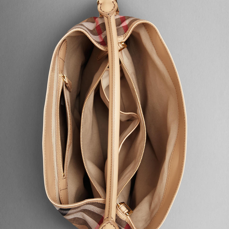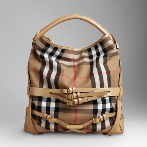 House check coated canvas hobo bag with multiple crossover leather buckle straps