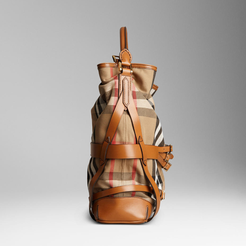 House check coated canvas hobo bag with multiple crossover leather buckle straps