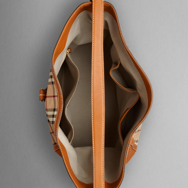 - Top buckle strap closure with polished metal attachments and press-stud fastening