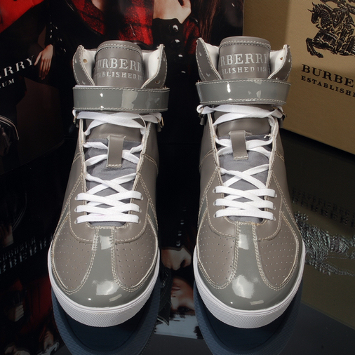 Round toe leather high-top trainers with perforated leather at toe and ankle Velcro leather ankle strap, lace-up closure, rubber sole High tongue printed with the Burberry logo