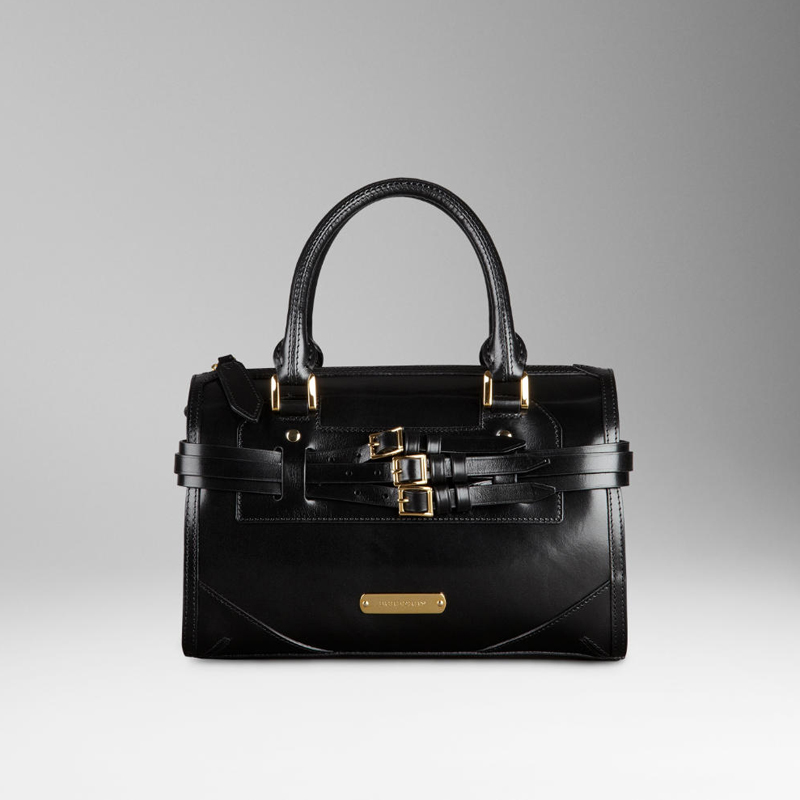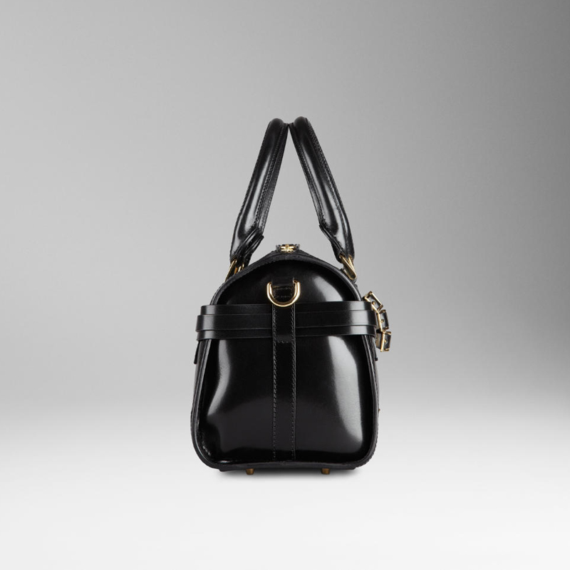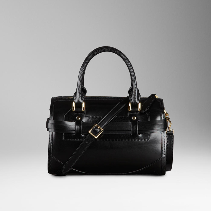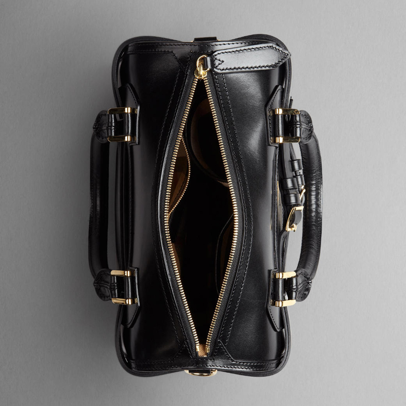 - Zip top closure with leather zip pull, two rolled leather handles, detachable leather shoulder strap