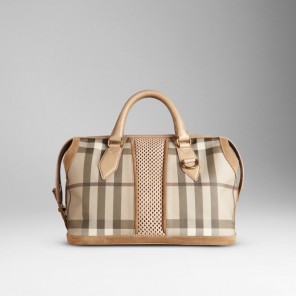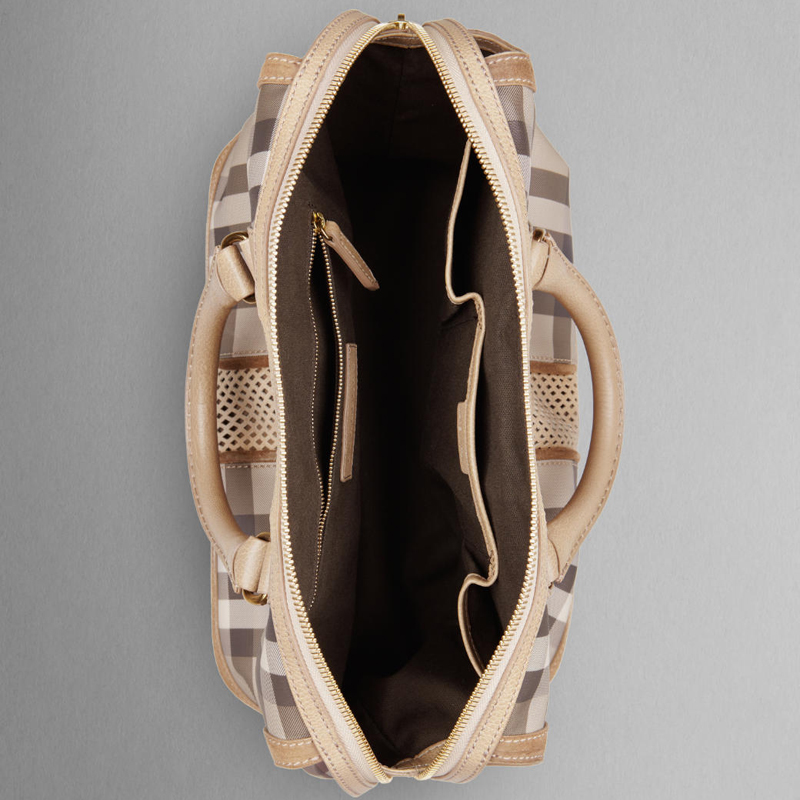 Charcoal check coated canvas bowling bag with leather mesh panels and suede trim on the front