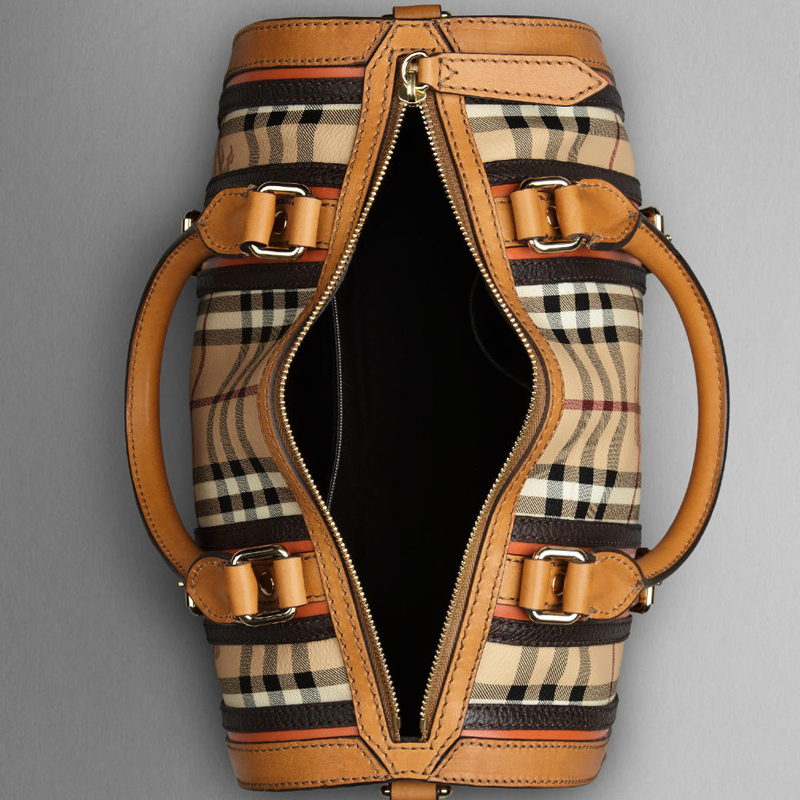 Haymarket check bowling bag with leather belt details and polished metal embellishments