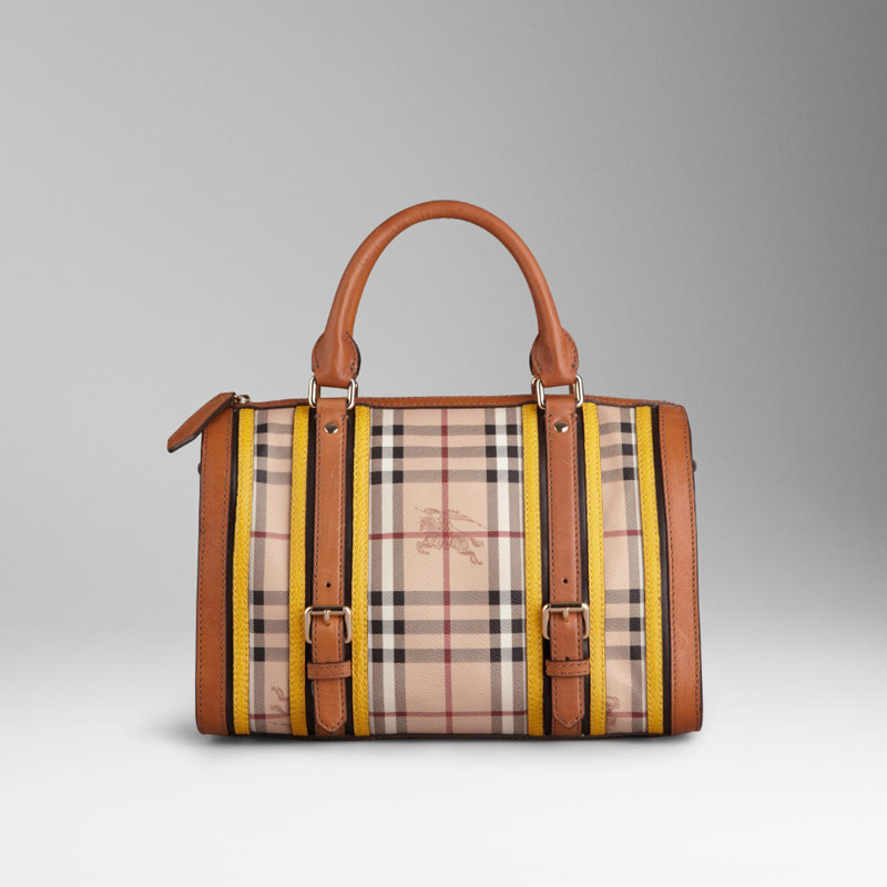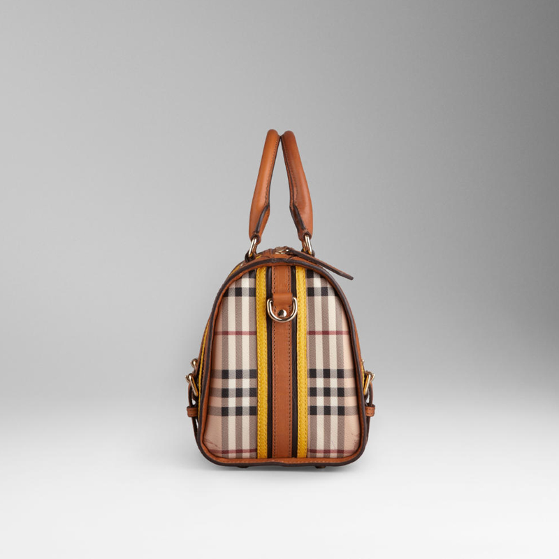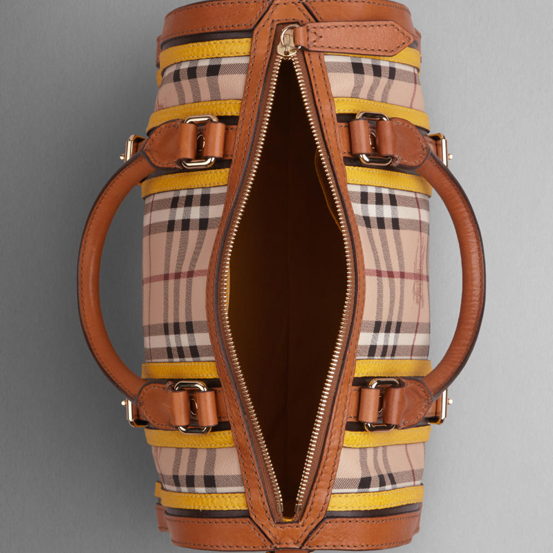Haymarket check bowling bag with leather belt details and polished metal embellishments