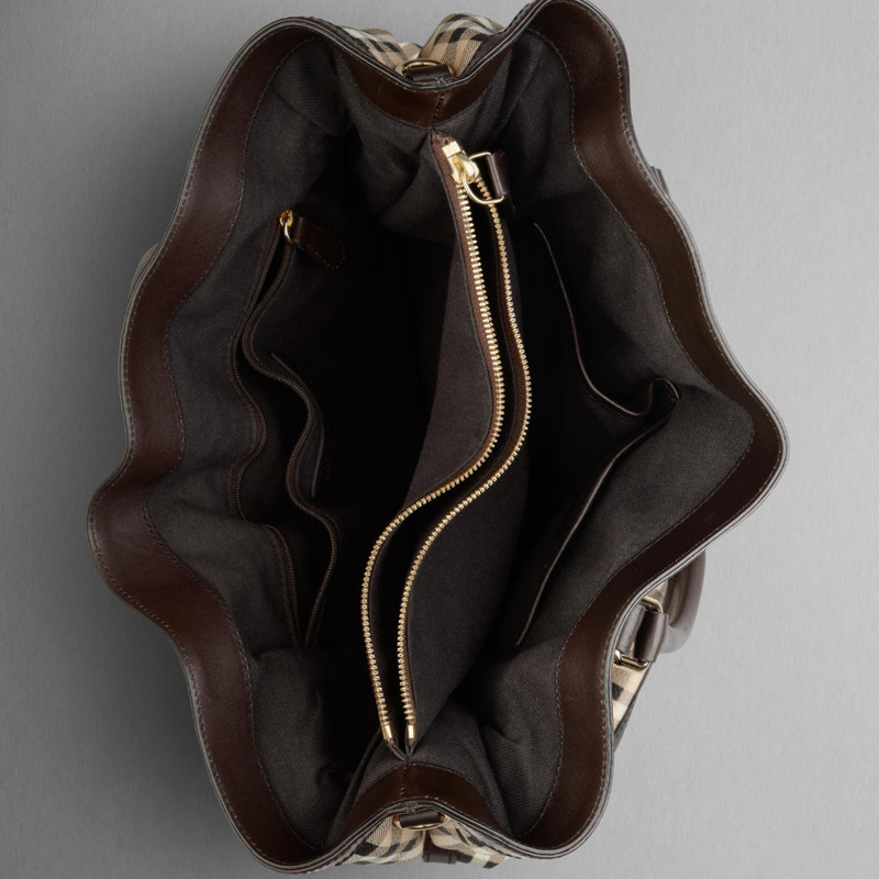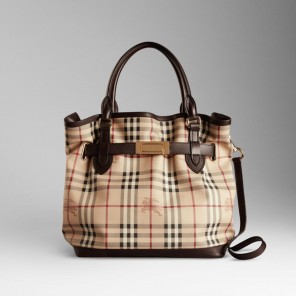 Medium Haymarket check tote bag with flat leather belt and metallic buckle