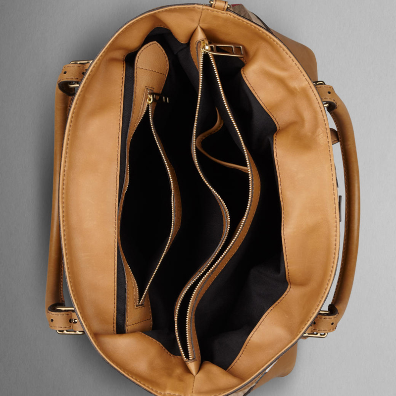 - The top of the bag is belted in webbed canvas with a polished metallic buckle at the front