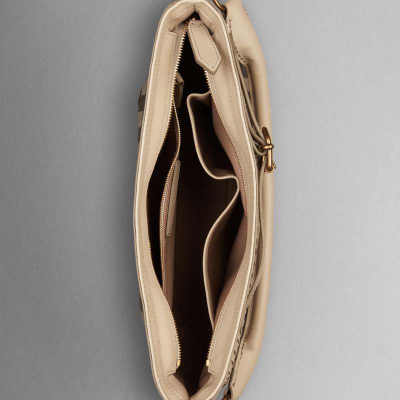 - Top zip closure, rolled leather handle and detachable adjustable flat leather shoulder strap